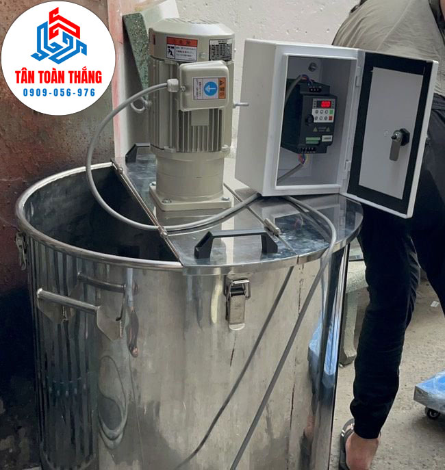 Bước 3 (Vận hành & Chỉnh tốc độ): Bật công tắc nguồn. Sử dụng núm vặn trên biến tần để tăng tốc độ khuấy lên từ từ. Tuyệt đối không bật tốc độ tối đa ngay lập tức để tránh sốc tải motor và văng hóa chất. Tốc độ khuấy sẽ được chỉnh tùy theo độ đặc của mẻ dầu gội/nước rửa chén.